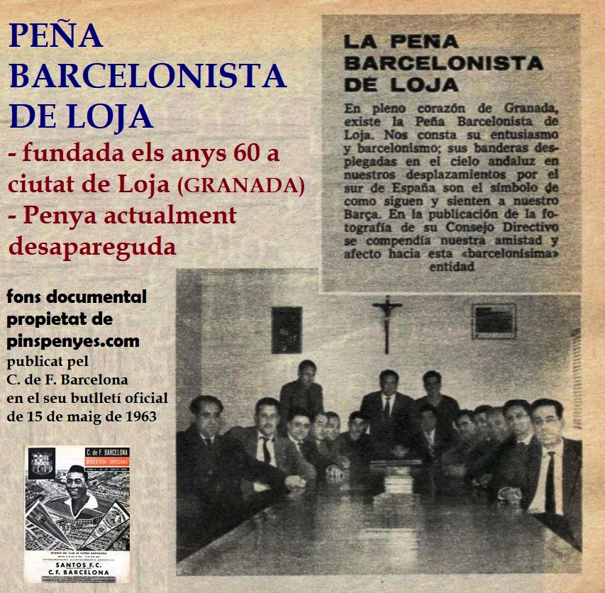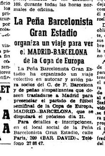 Peña Barcelonista Gran EstadioLa Peña Barcelonista Gran Estadio va ser una penya activa durant la dècada de 1960. La seva existència està documentada tant per la premsa esportiva de l'època com per material gràfic institucional. Diverses notícies publicades al Mundo Deportivo recullen activitats pròpies d'una penya plenament organitzada, com ara la organització de desplaçaments oficials per assistir a partits del FC Barcelona, incloent-hi competicions europees, així com la disposició d'una seu social identificable a la ciutat de Barcelona. A més, la penya apareix representada amb el seu escut propi en una fotografia col·lectiva de penyes de l'any 1964, en un context institucional on només hi figuren entitats reconegudes pel Club. Aquest fet confirma el seu reconeixement dins l'estructura penyística del FC Barcelona en aquell moment. Malgrat aquestes evidències, la Peña Barcelonista Gran Estadio no figura actualment als llistats oficials digitals del Club, fet que indica una desaparició posterior sense continuïtat administrativa o documental, una circumstància habitual en moltes penyes dels anys cinquanta i seixanta. |