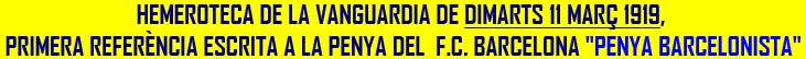 Penya Barcelonista del FC Barcelona - 1919 : .- Manuel Tomàs (documentalista del Barça), explica com el juliol del 1919 es va oficialitzar la primera Penya Barcelonista –anomenada així, a seques- per muntar un ball de Sant Jaume al camp del carrer Indústria.) .- en la reunió del Consell Directiu del FC Barcelona d'aquell dia es donava permís a una nova penya, la Penya Barcelonista del FC Barcelona, per a organitzar un ball el dia de la revetlla de Sant Jaume, això significa el primer reconeixement escrit oficial cap a una Penya, si no surten nous documents... |
